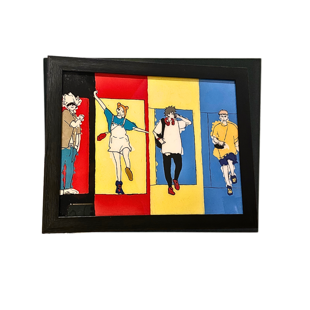 Step into a world of vibrant energy with this captivating glass painting. Four distinct spirits come together in a dance of colors and forms, creating a harmonious masterpiece. Allow the dynamic essence of this art to ignite your imagination, each brushstroke telling a tale of connection, adventure, and shared destinies. Embrace the enigma within the glass, where powerful souls converge in a visual symphony that transcends the boundaries of ordinary art.